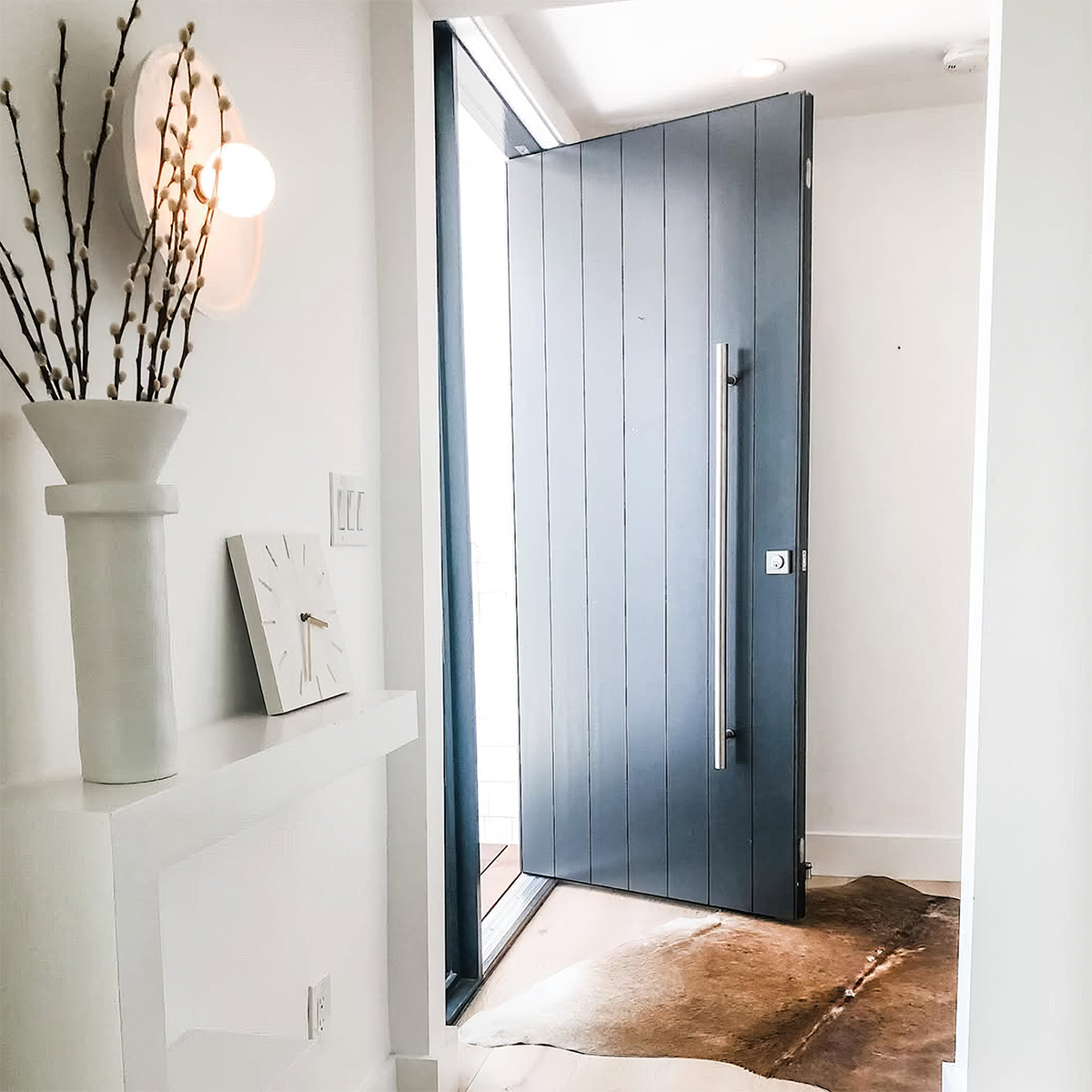 The pivot placement is the distance the pivot pin will be placed away from the vertical edge of the rough opening. Generally speaking, we suggest placing the pivot over one quarter of the distance of the door width. We find that this presents a solid aesthetic for most door dimensions.